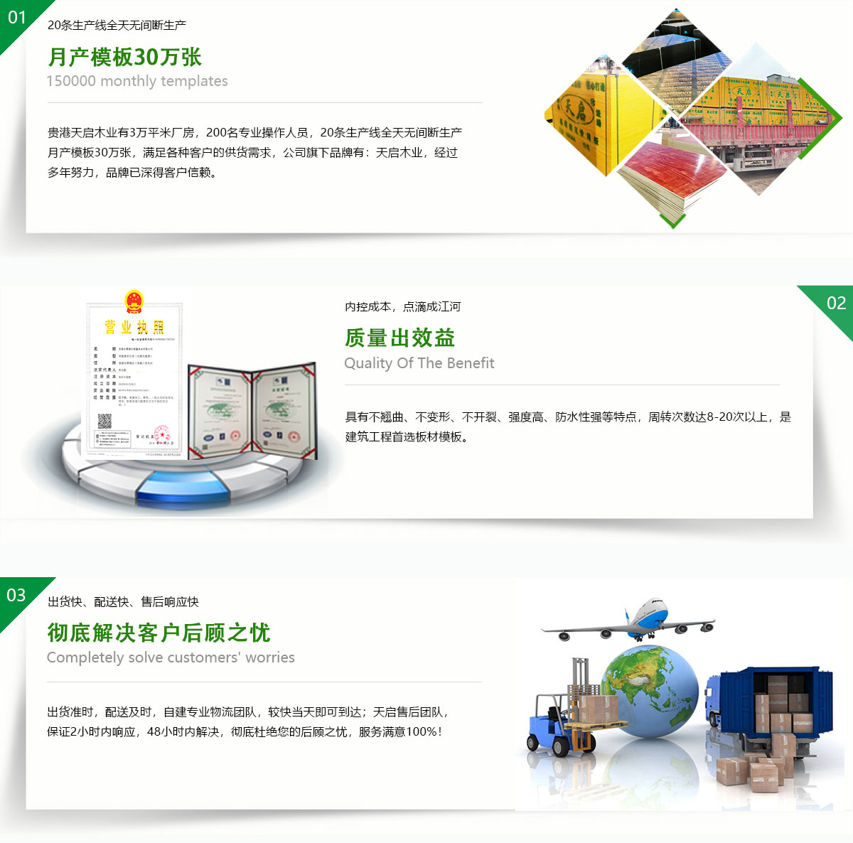天啟木業(yè)主營(yíng):建筑木模板、膠合板、覆膜板、清水建筑模板、橋梁建筑模板、優(yōu)質(zhì)高端建筑模板。產(chǎn)品質(zhì)量倍受認(rèn)可,贏得了眾多客戶(hù)的一致好評(píng)。天啟人愿廣交天下朋友,精誠(chéng)合作,互惠互利,共創(chuàng)美好未來(lái)。咨詢(xún)電話:13669498777